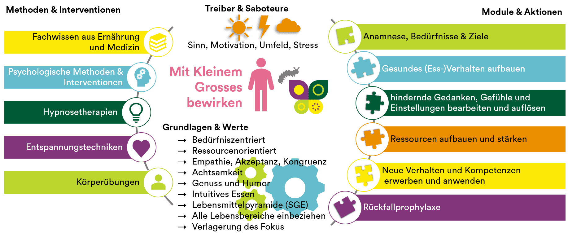 In den Beratungen kombinieren wir mein Fachwissen aus Ernährung, Schulmedizin, Psychologie und Hypnosetherapien mit deinen eigenen Erfahrungen, Gefühlen und deinem Körpererleben. Denn du bist der Experte, die Expertin für dich selbst. Mit den Methoden aus der Psychologie, Körperübungen, Entspannungstechniken lassen sich störende Gedanken und Einstellungen bearbeiten, Emotionen und Spannungen regulieren, Stärken aufbauen und festigen. So erzielst du dauerhafte und wirkungsvolle Verhaltensänderungen, die dir helfen, spielerisch, leicht und mit Freude dein ganz persönliches körperliches und psychisches Wohlfühl-Ziel zu erreichen.